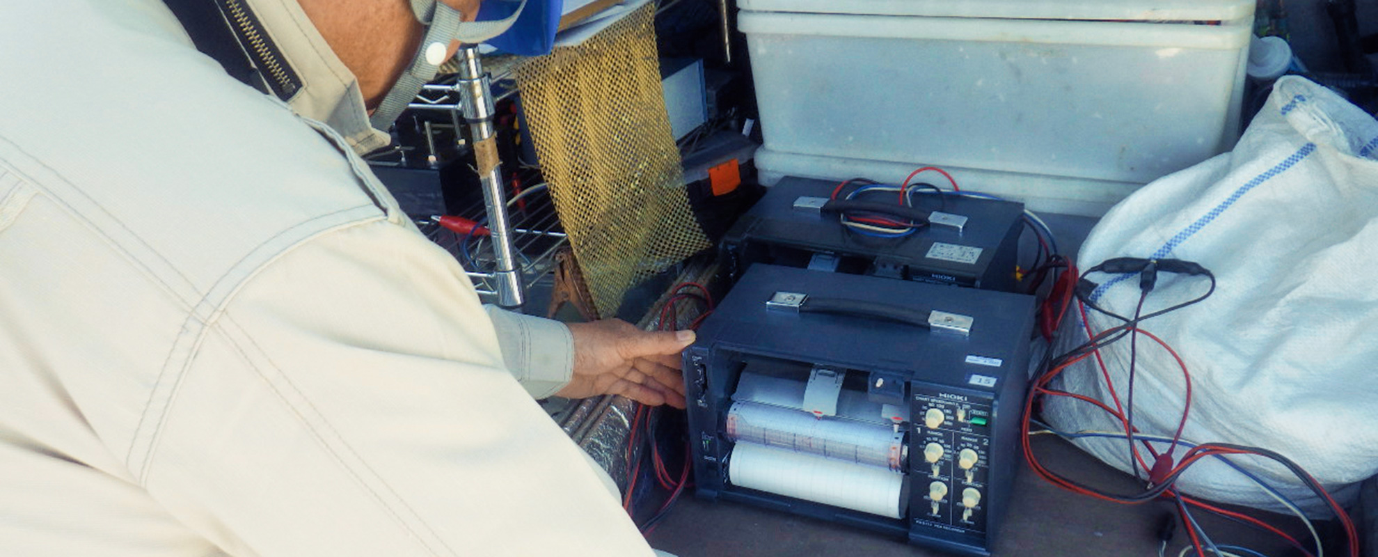 各種設備へ赴き、専用の測定機器を防食設備に接続し、測定記録を行い、対象のライフライン埋設導管が健全な防食状況にあるかを確認します。 -
